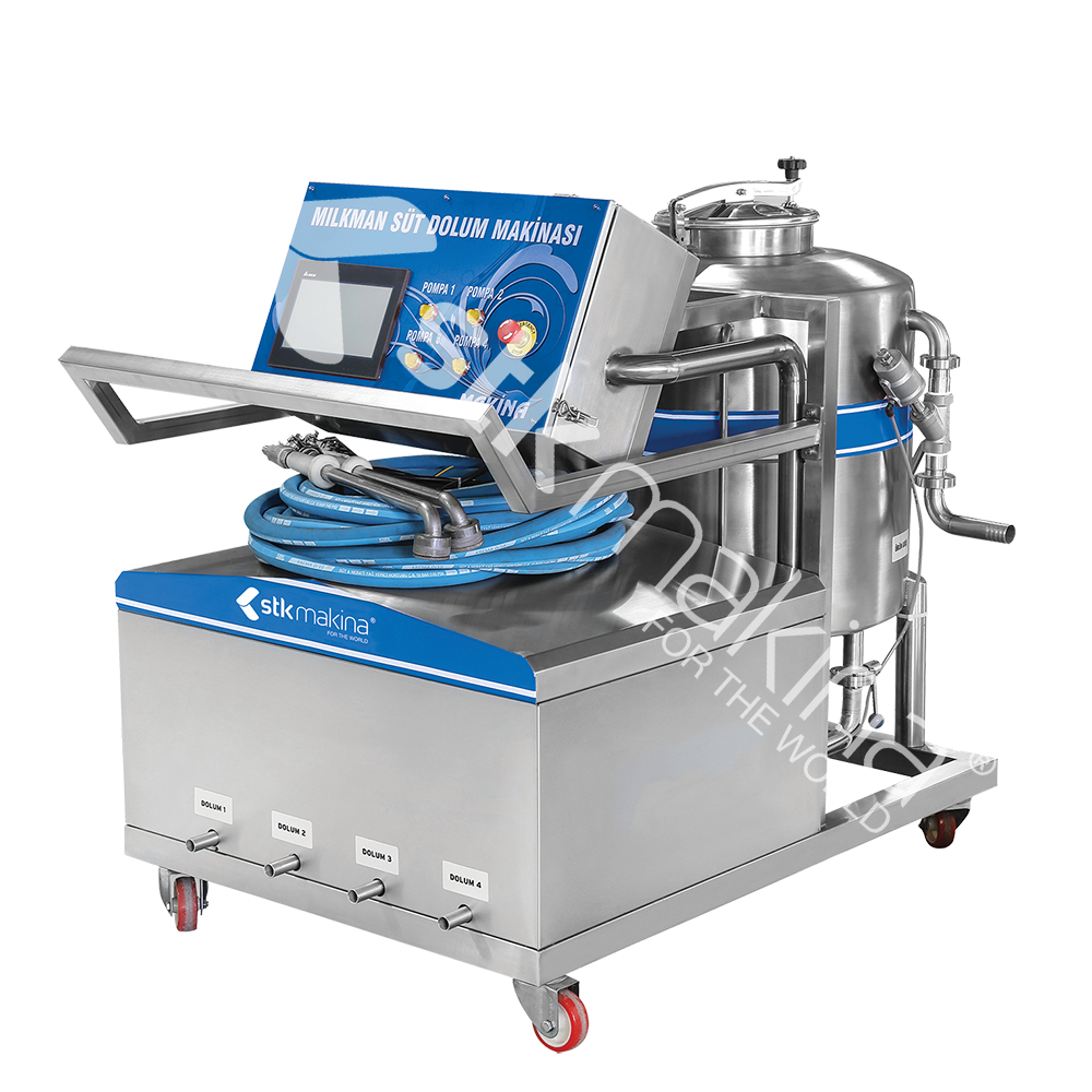 Milkman Süt dolum makinası ikili, üçlü, dörtlü modellerle güçlü STK MAKİNA pompalarıyla yapılandırılan elektromanyetik flowmater destekli PLC ve dokunmatik ekranla kumanda edilebilen hassas dolum makinası.